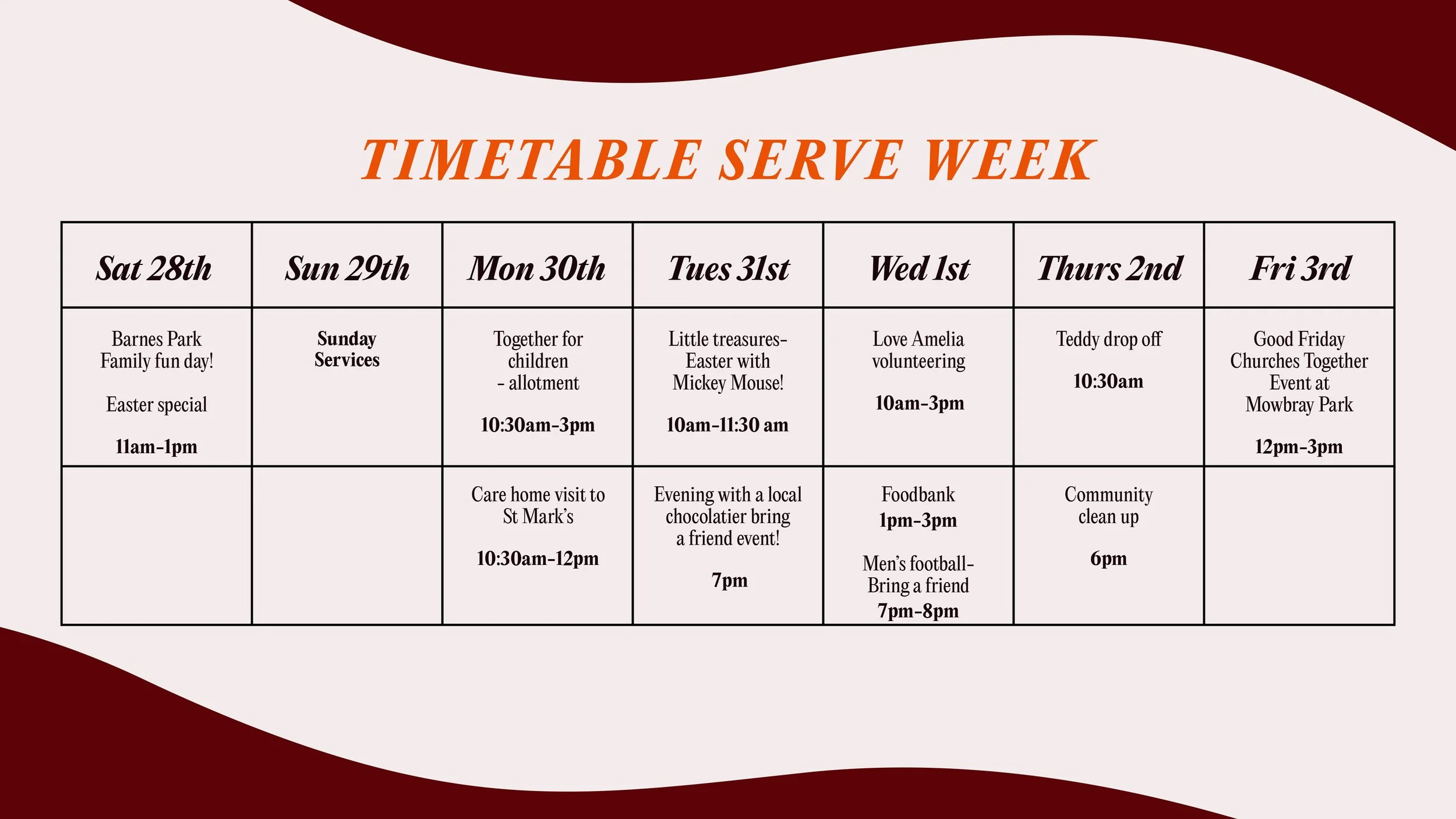 28th March - 4 April 2026 I would like to serve Bring a Friend to one of the below Events happening during Serve Week! Easter Egg Hunt and Crafts @ Barnes Park Little Treasures - Easter with Mickey Mouse Evening with a local Chocolatier 5-a-side Football